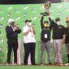 Quilvio Hernández presidente de los aguiluchos, Félix Fermín, manager campeón, el Capitán Juan Carlos Pérez y Melky Cabrera recibieron el codiciado trofeo de campeones.